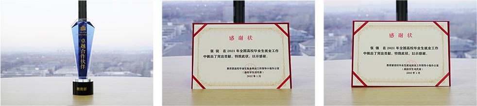 2021年,万学在高校毕业生就业工作方面贡献卓越,获教育部颁发“卓越合作伙伴”荣誉奖杯,并为开云董事长张锐、执行总裁张强颁发感谢状。