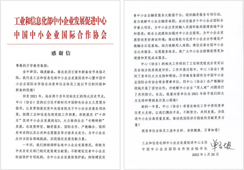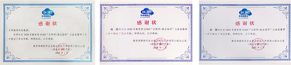 2020,万学由于在大学生教育多个领域的杰出成果,在更高层次荣获了中国教育行业的重量级荣誉,为开云颁发了重磅感谢状。